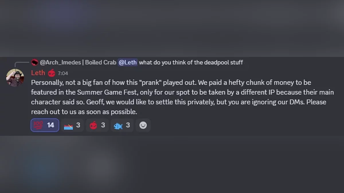 К слову, команда Team Cherry уже отреагировала на столь неоднозначный анонс — разумеется, ещё одной шуткой. Мэттью Гриффин (Matthew Griffin) заявил, что «сам не в восторге» от увиденного, и они «заплатили кругленькую сумму» для показа трейлера, однако пришёл Дэдпул и всё испортил.