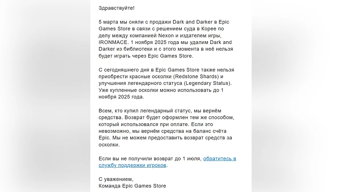 Epic Games начала рассылать пользователям EGS сообщения на электронную почту, в котором заявила, что фэнтезийный экшен Dark and Darker будет удален из библиотеки. Это произойдет 1 ноября 2025 года.