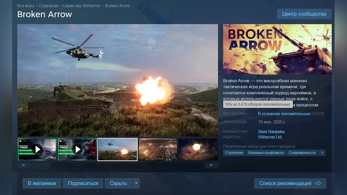 Геймеры в Steam уже оценили масштабную военную игру Broken Arrow, в которой доступно 1500 возможных комбинаций