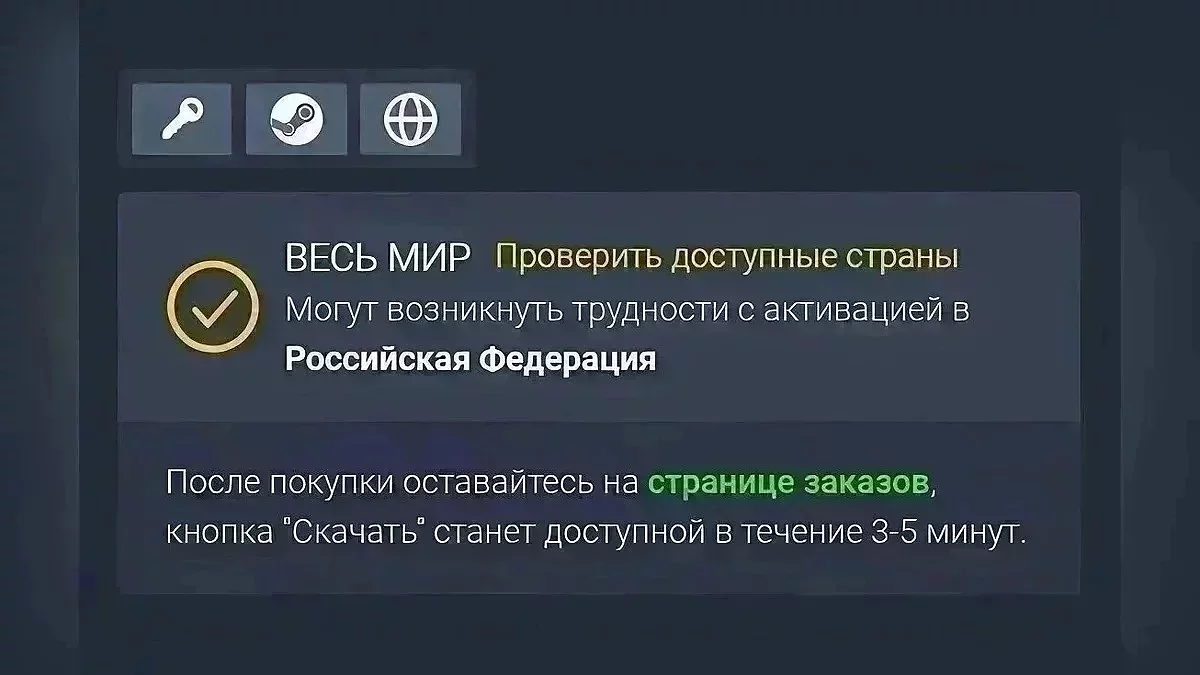 В связи с санкциями многие издатели удалили свои игры из российского Steam. В таком случае с активацией ключа в этом регионе могут возникнуть проблемы. Соответствующая надпись будет в описании товара: