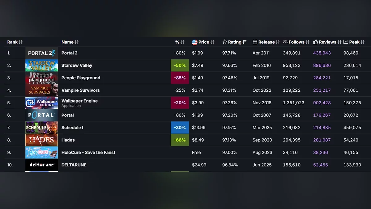 Отметим, что сайт SteamDB показывает немного другой рейтинг. Например, Portal 2 всё ещё сохраняет за собой первое место, а Deltarune замыкает «десятку» лучших игр — вероятно, данные пока не обновились. Также Stardew Valley и Portal 2 получили по 98% пользовательского рейтинга в Steam, однако у симулятора фермы практически в два раза больше отзывов.