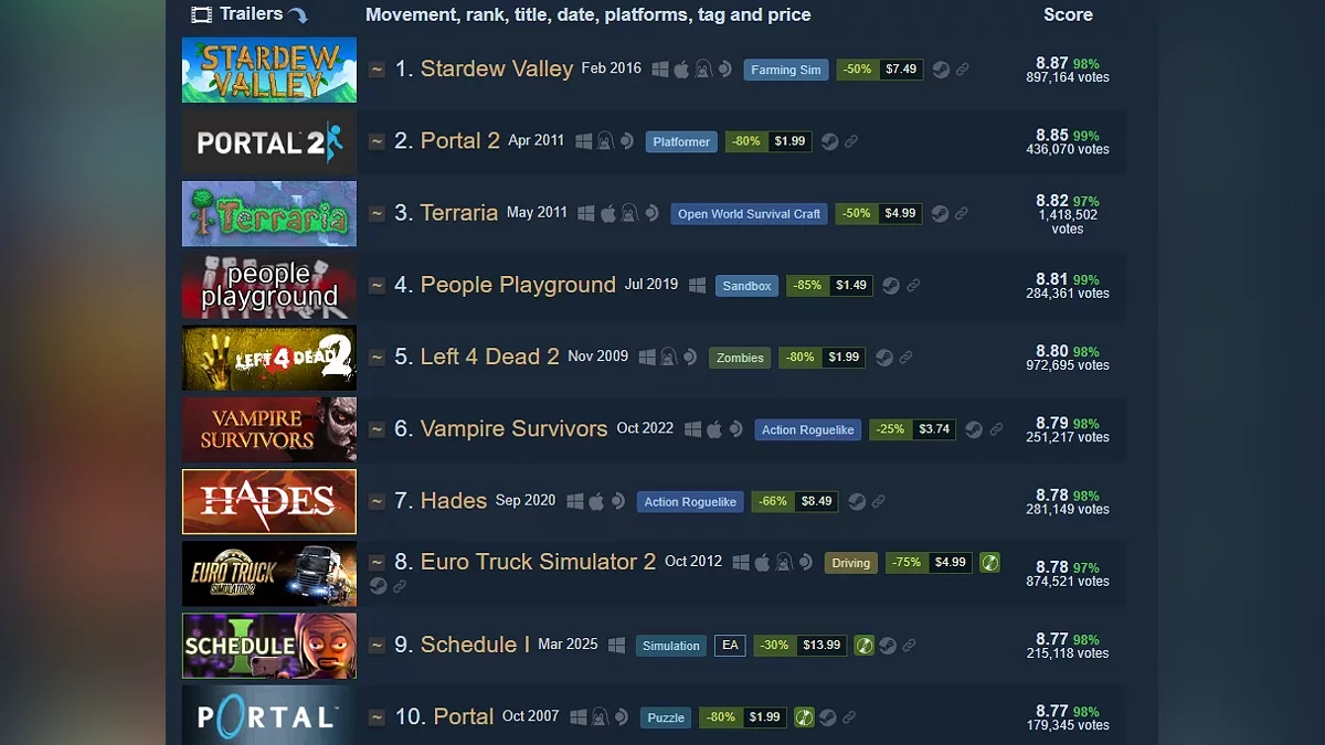 В Steam появилась новая самая высокооценённая игра — она обогнала Portal 2