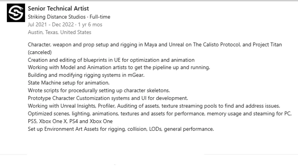 В сети обратили внимание на LinkedIn одного из сотрудников Striking Distance Studios, известной по The Callisto Protocol. Его профиль сообщает о закрытии одного из проектов, который разрабатывался студией.