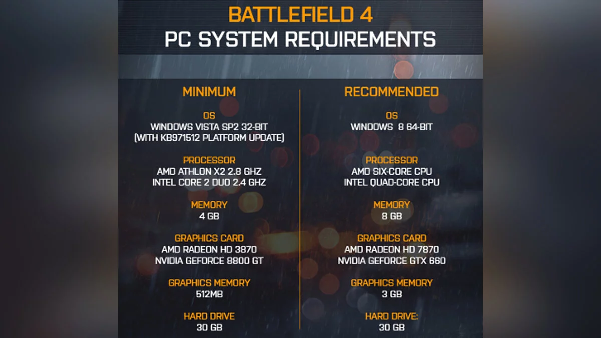 Как и свой предшественник, Battlefield 4 не поддерживает Windows XP, а финальные спецификации Battlefield 4 выглядят следующим образом.