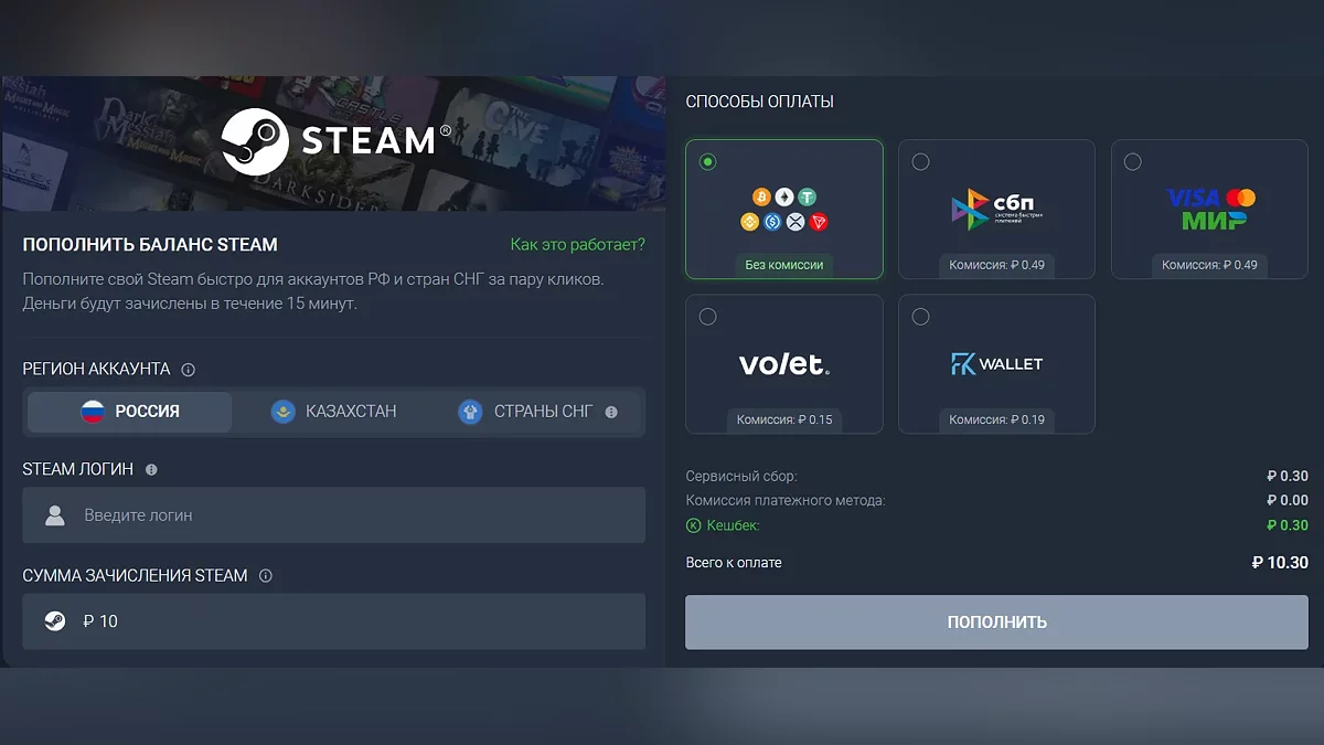 Кроме того, геймеры также могут пополнить баланс Steam (с 3% комиссией сервиса) на любую сумму от 10 руб.