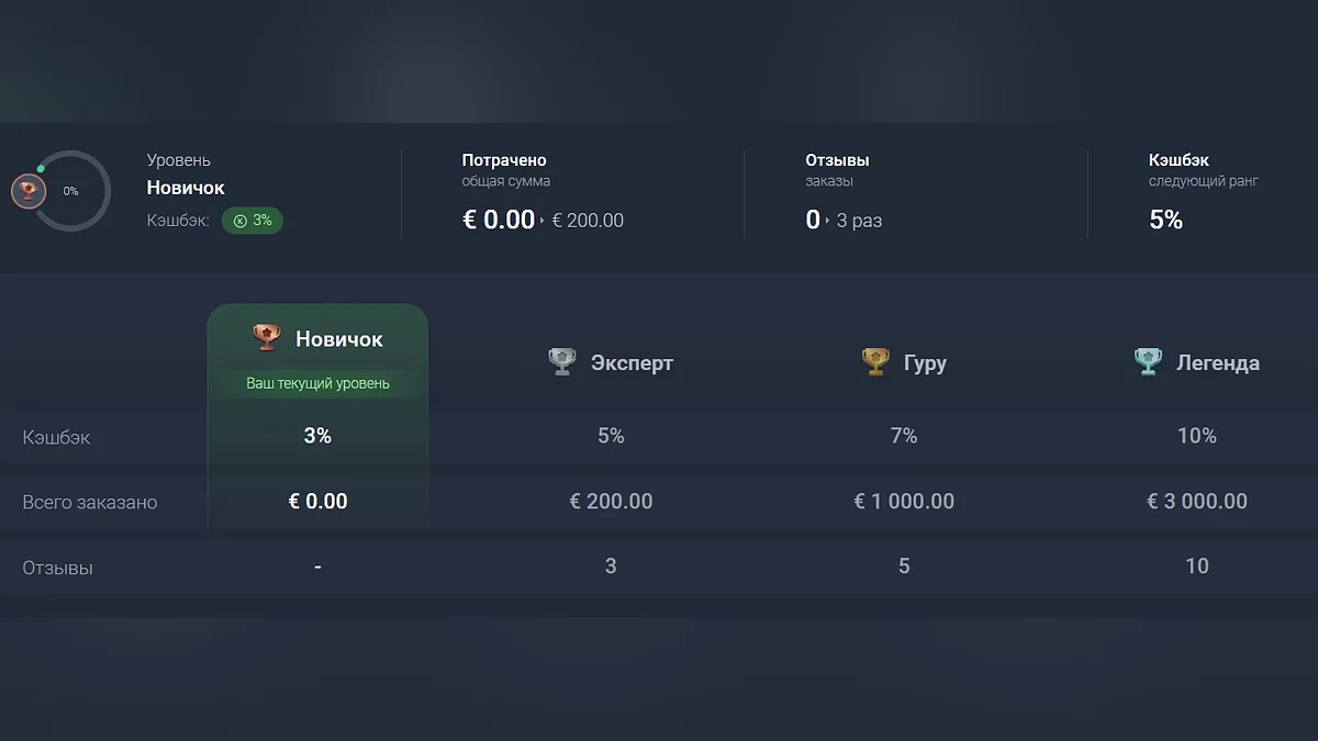 За каждое приобретение пользователи получают вознаграждение до 10% от потраченной суммы. Уровень кешбэка зависит от ранга на платформе — чем больше покупок и активности, тем он выше.