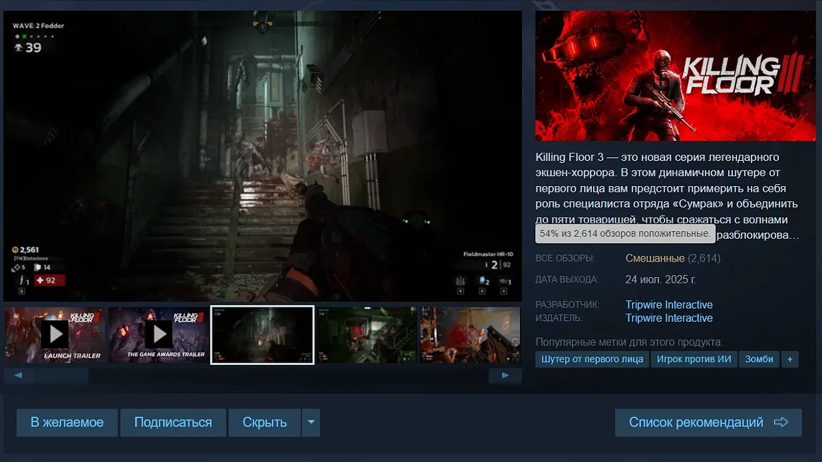 24 июля на PC, PS5 и Xbox Series X/S состоялся релиз экшен-хоррора Killing Floor 3, который, как оказалось, собрал в Steam смешанные отзывы. На момент написания новости рейтинг проекта составляет всего 54%. Некоторые геймеры жалуются на баги и проблемы в работе серверов.
