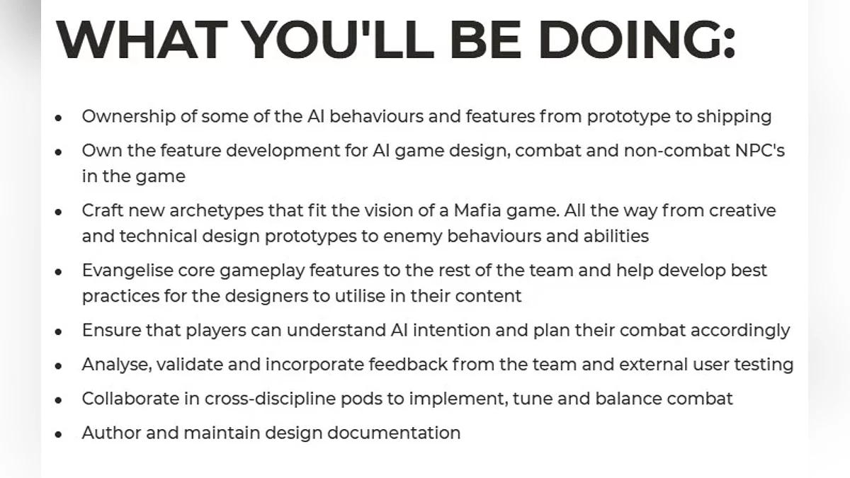 В списке вакансий указано, что студии нужен ведущий дизайнер искусственного интеллекта. Сотрудник будет заниматься Mafia: The Old Country, однако стоит принять во внимание, что до релиза игры остались считанные дни. Также описание содержит следующую строчку: «Создавайте новые архетипы, соответствующие видению игр Mafia. От творческих и технических прототипов до поведения и способностей врагов».