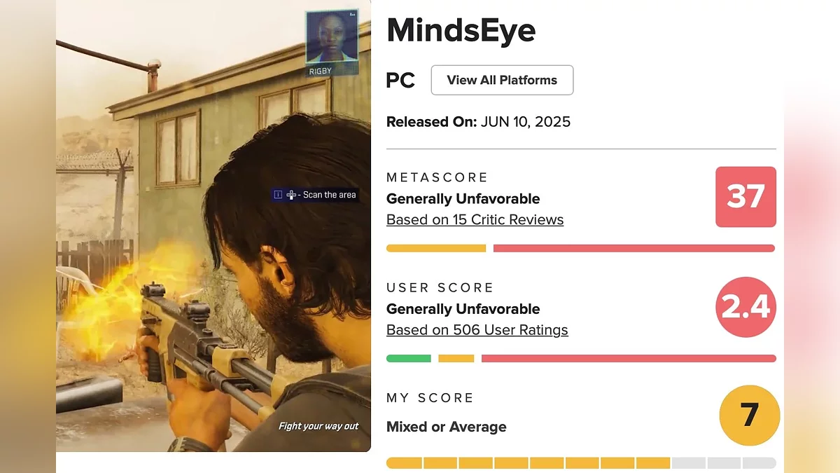 Проект вышел в июне 2025 года и получил низкие оценки из-за большого количества багов, скучного геймплея и плохого маркетинга. MindsEye создавалась студией Build a Rocket Boy под руководством Лесли Бензиса (Leslie Benzies) — одного из ключевых разработчиков GTA в прошлом. Из-за громкого имени Бензиса игру многие воспринимали как «убийцу GTA», что сильно завысило ожидания.