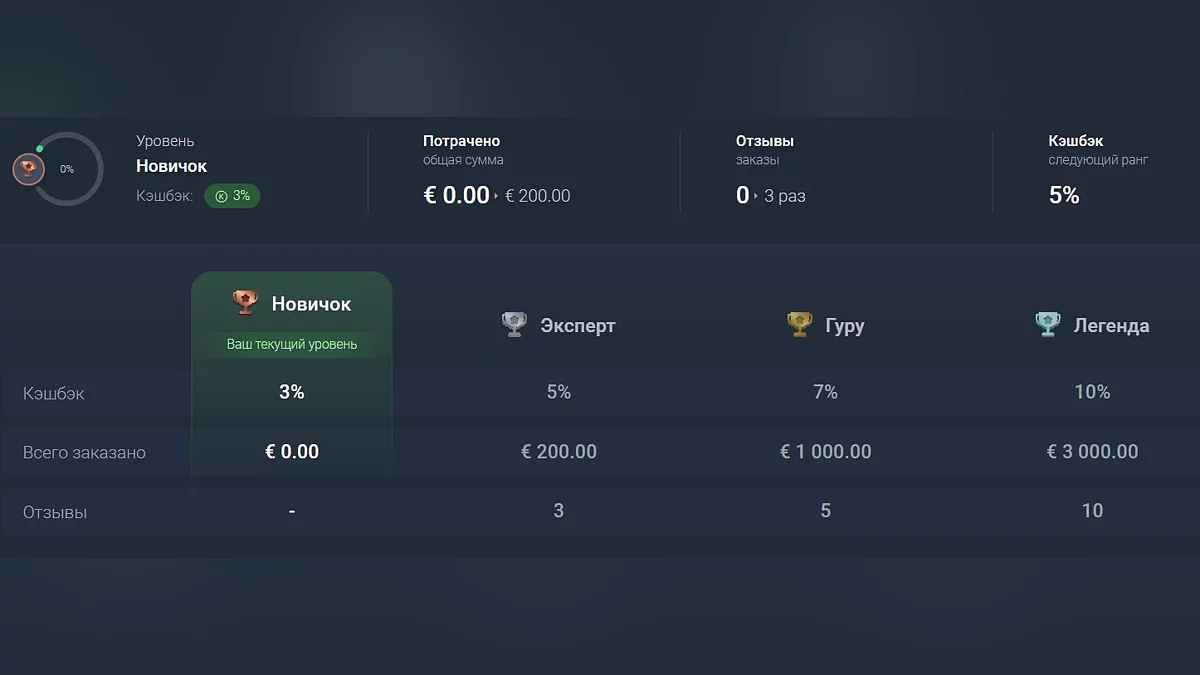 За каждое приобретение пользователи получают вознаграждение до 10% от потраченной суммы. Уровень кешбэка зависит от ранга на платформе — чем больше покупок и активности, тем он выше.