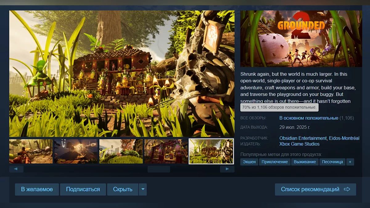 На PC (Steam) и Xbox Series X/S (Game Pass) в раннем доступе вышел приключенческий экшен с открытым миром и элементами выживания Grounded 2, разрабатываемый студиями Obsidian Entertainment и Eidos Montreal. В Steam проект получил в основном положительные отзывы.