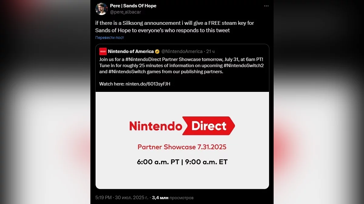 Создатель приключенческой игры Sands of Hope Пере Альбакар (Pere Albacar) пообещал в соцсетях подарить свой проект любому, кто ответит на его пост, если дату выхода Silksong назовут во время сегодняшней Nintendo Direct. Однако ситуация немного вышла из-под контроля: его публикация за сутки собрала почти 3,5 миллиона просмотров и тысячи реплаев. На такой итог Пере Альбакар отреагировал иронично: «Не ожидал здесь 20 тысяч комментариев, ха-ха».
