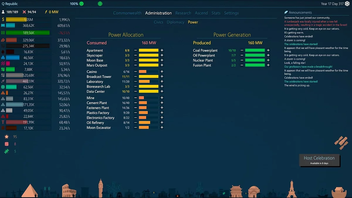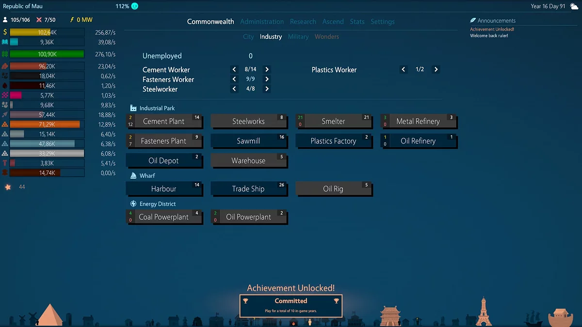 Idle Commonwealth — кликер, в котором игрок развивает сообщество, увеличивает население, строит здания, распределяет жителей по профессиям, устанавливает налоги и форму правления, исследует новые технологии и взаимодействует с другими народами. Можно собирать ресурсы, торговать или завоевывать соседей, получать достижения для усиления производства, а также использовать престиж для открытия нового контента. В будущем планируются расширения, включая генетические модификации населения и колонизацию космоса. Проект имеет рейтинг 60%. Раньше он продавался за 320 руб.