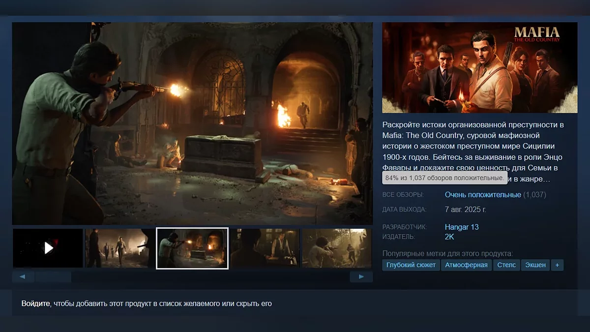 Совсем недавно состоялся релиз Mafia: The Old Country, которая уже получила первую тысячу отзывов в Steam. На момент написания новости рейтинг проекта составляет 84%.
