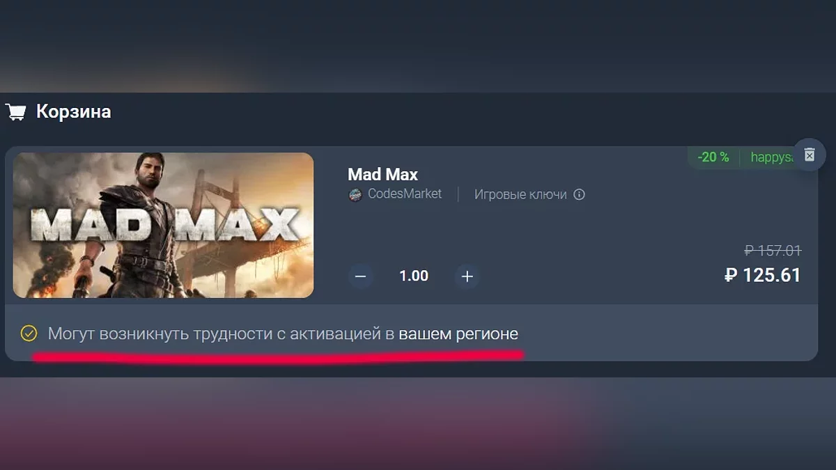 В связи с санкциями многие издатели удалили свои игры из российского Steam. В таком случае с активацией ключа в этом регионе могут возникнуть проблемы. Соответствующая надпись будет в описании товара: