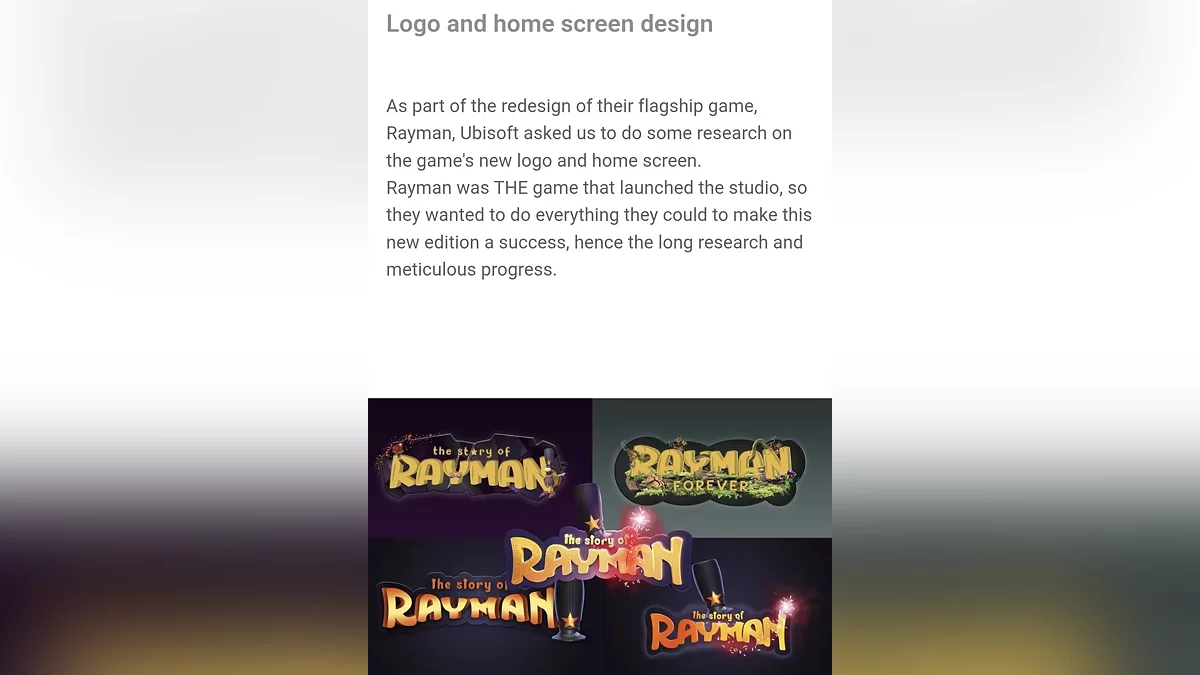 В рамках редизайна своей флагманской игры Rayman компания Ubisoft попросила нас провести исследование нового логотипа и домашнего экрана игры. Rayman был игрой, с которой началась студия, поэтому они хотели сделать все возможное, чтобы новое издание стало успешным, отсюда долгие исследования и скрупулезная работа.