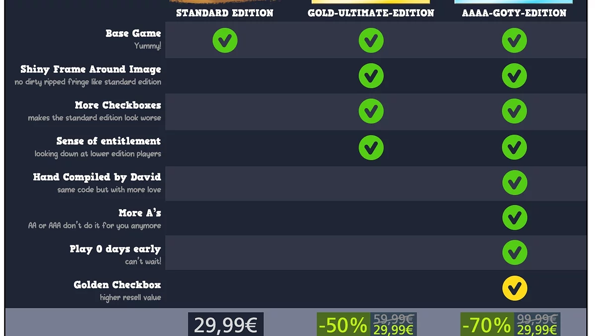 Примечательно, что при продвижении своего проекта разработчики с иронией обыграли популярные тренды в игровой индустрии, предложив юмористические издания: Standard Edition, Gold-Ultimate-Edition и AAAA-GOTY-Edition, где более дорогие версии включают в себя такие бонусы, как сверкающая рамка вокруг обложки и ощущение собственной значимости.