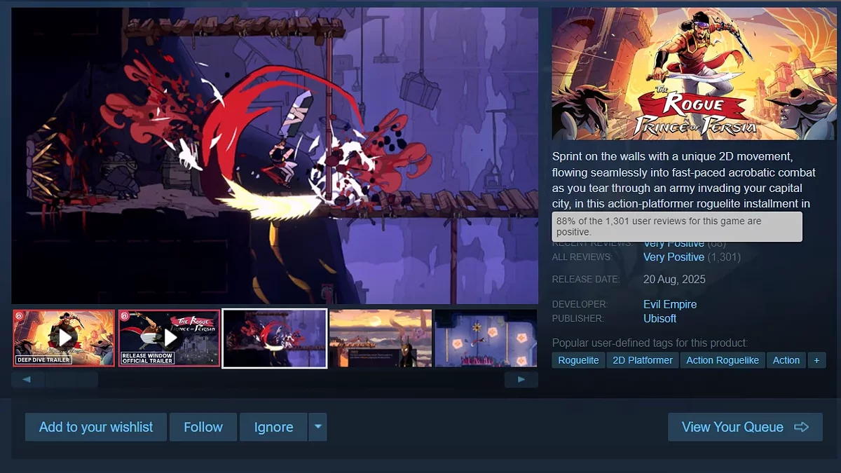 На PC, PS5 и Xbox Series X/S вышла полная версия 2D-экшена с элементами платформера The Rogue Prince of Persia, который ранее находился в раннем доступе Steam, где получил 88% положительных отзывов. Игра была разработана студией Evil Empire и издана компанией Ubisoft.