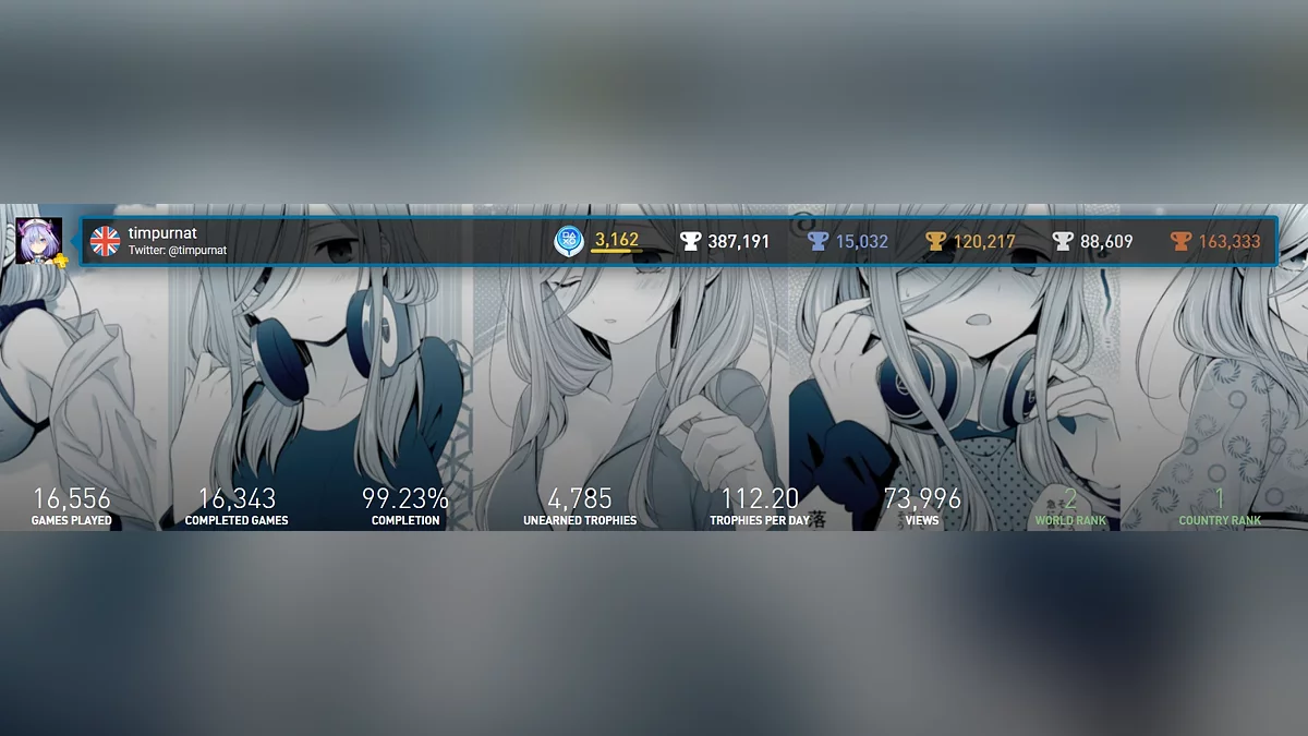 На платформе PSN Profiles timpurnat занимает второе место в мире (20437395 очков). На первом месте находится dav1d_123, которому удалось получить 15,5 тыс платиновых трофеев и 21307740 очков. Именно он держатель рекорда Гиннесса за наибольшее количество подтвержденных ачивок. Третье место в рейтинге сейчас занимает геймер ginko765 (20376285 очков).