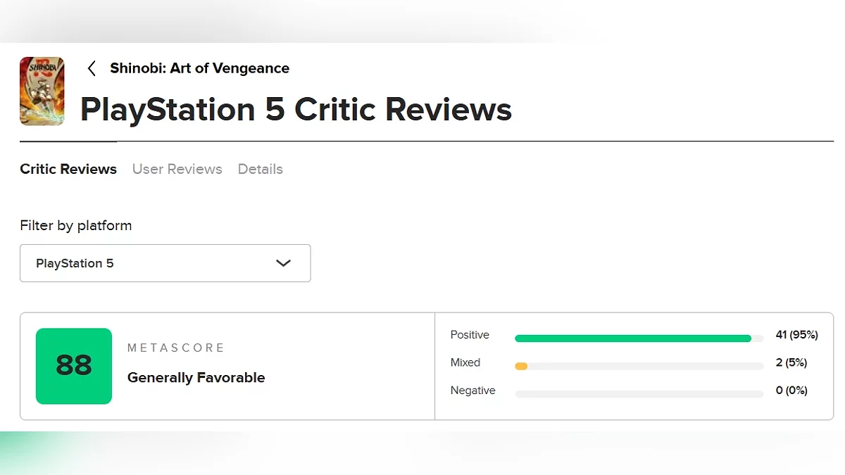 На Metacritic появились оценки нового экшена с элементами платформера Shinobi: Art of Vengeance, который разработан компанией SEGA совместно с Lizardcube (соавторы Streets of Rage 4). В целом критики положительно оценили проект. Средняя оценка составляет 88 баллов.
