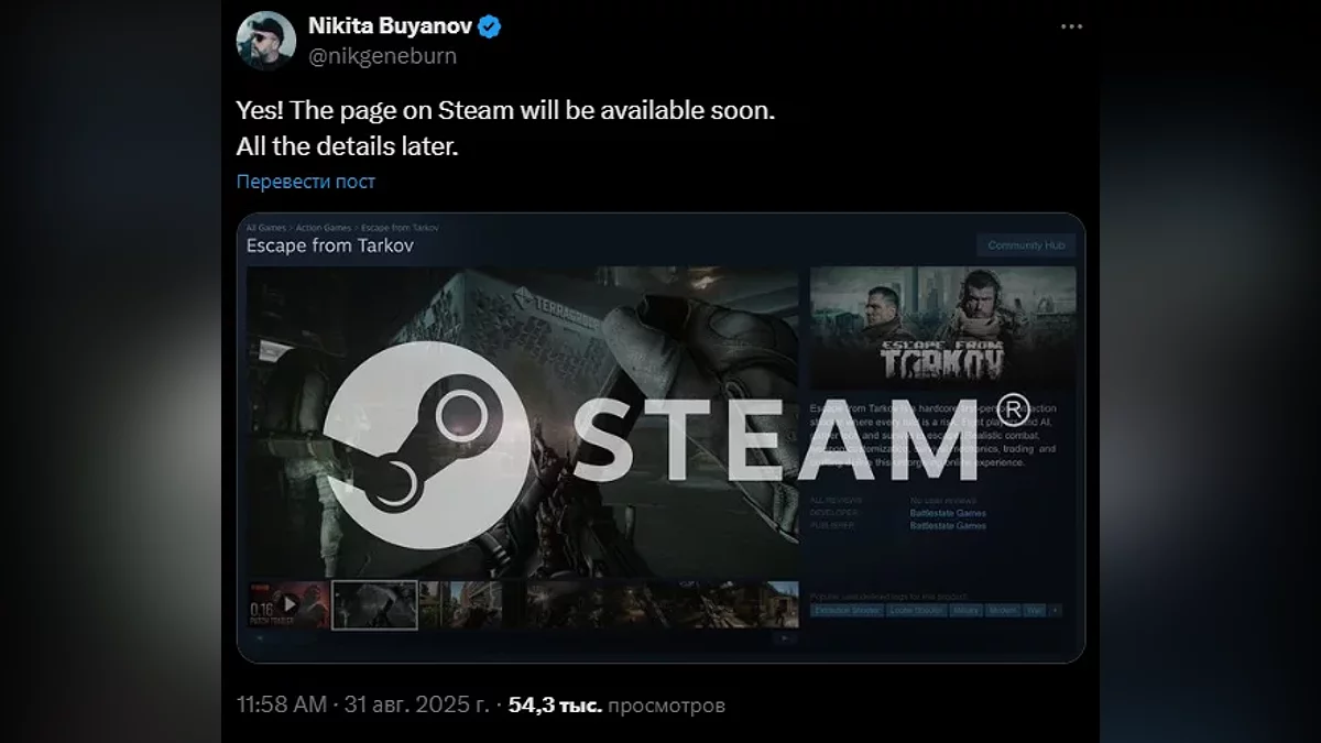 Глава студии и геймдиректор Никита Буянов неожиданно запостил в своих соцсетях GIF-изображение с паром — более чем явный намёк на платформу Valve, поскольку «пар» переводится на английский язык как «steam». В свою очередь Battlestate Games поделилась публикацией своего СЕО и добавила эмодзи пара, не оставляя широкого пространства для домыслов. Пользователи логично предположили, что разработчики Escape from Tarkov в своей обычной манере сообщили о выходе шутера в Steam, чего многие ждали очень давно.