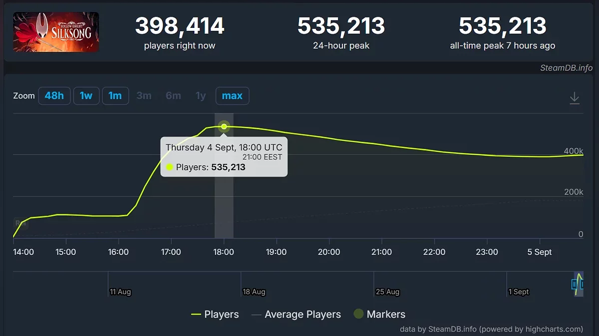 4 сентября состоялся релиз долгожданной метроидвании Hollow Knight: Silksong, которая из-за наплыва игроков «сломала» серверы Steam, из-за чего страничка проекта была недоступна некоторое время. Всего за день игра собрала свыше 2 тыс положительных отзывов. На момент написания новости рейтинг составляет 96%.