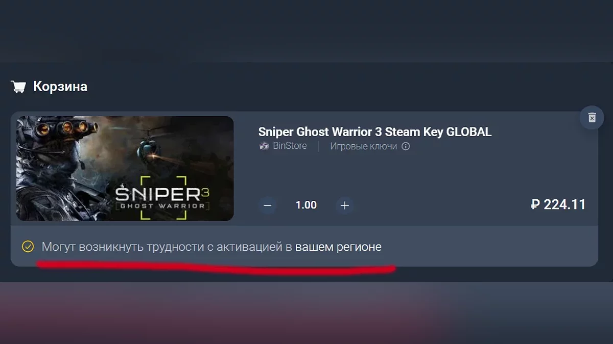 В связи с санкциями многие издатели удалили свои игры из российского Steam. В таком случае с активацией ключа в этом регионе могут возникнуть проблемы. Соответствующая надпись будет в описании товара: