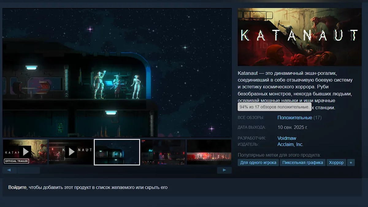 В Steam состоялся релиз 2D-экшена с элементами рогалика, метроидвании и космического хоррора под названием Katanaut. Имеется демоверсия для ознакомления с геймплеем. Игра уже получила первые отзывы. На момент написания новости рейтинг составляет 94%.