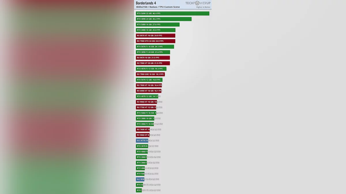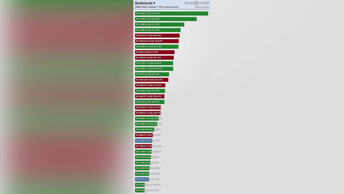 Портал TechPowerUp протестировал компьютерную версию шутера Borderlands 4 на 33 разных видеокартах. Игра запускалась с максимальными настройками графики без DLSS и FSR.