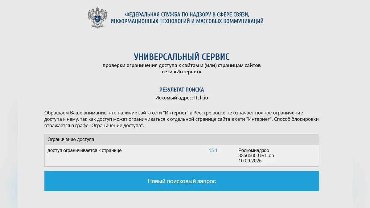 Роскомнадзор внёс популярную платформу с инди-играми Itch.io в реестр запрещённых к просмотру в России страниц. Решение было вынесено ещё 10 сентября, сейчас доступ к ресурсу ограничен.