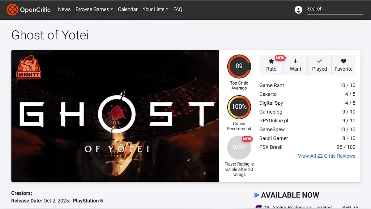 Эмбарго на отзывы спало, и зарубежные игровые издания опубликовали свои оценки Ghost of Yotei. Новый экшен в японском сеттинге от создателей Ghost of Tsushima получил 88/100 баллов на Metacritic и 89/100 баллов на OpenCritic.