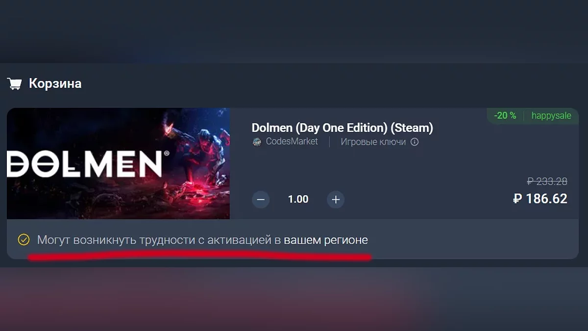 В связи с санкциями многие издатели удалили свои игры из российского Steam. В таком случае с активацией ключа в этом регионе могут возникнуть проблемы. Соответствующая надпись будет в описании товара: