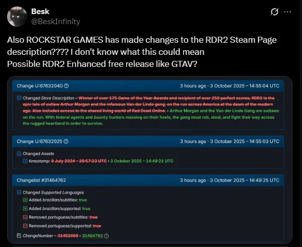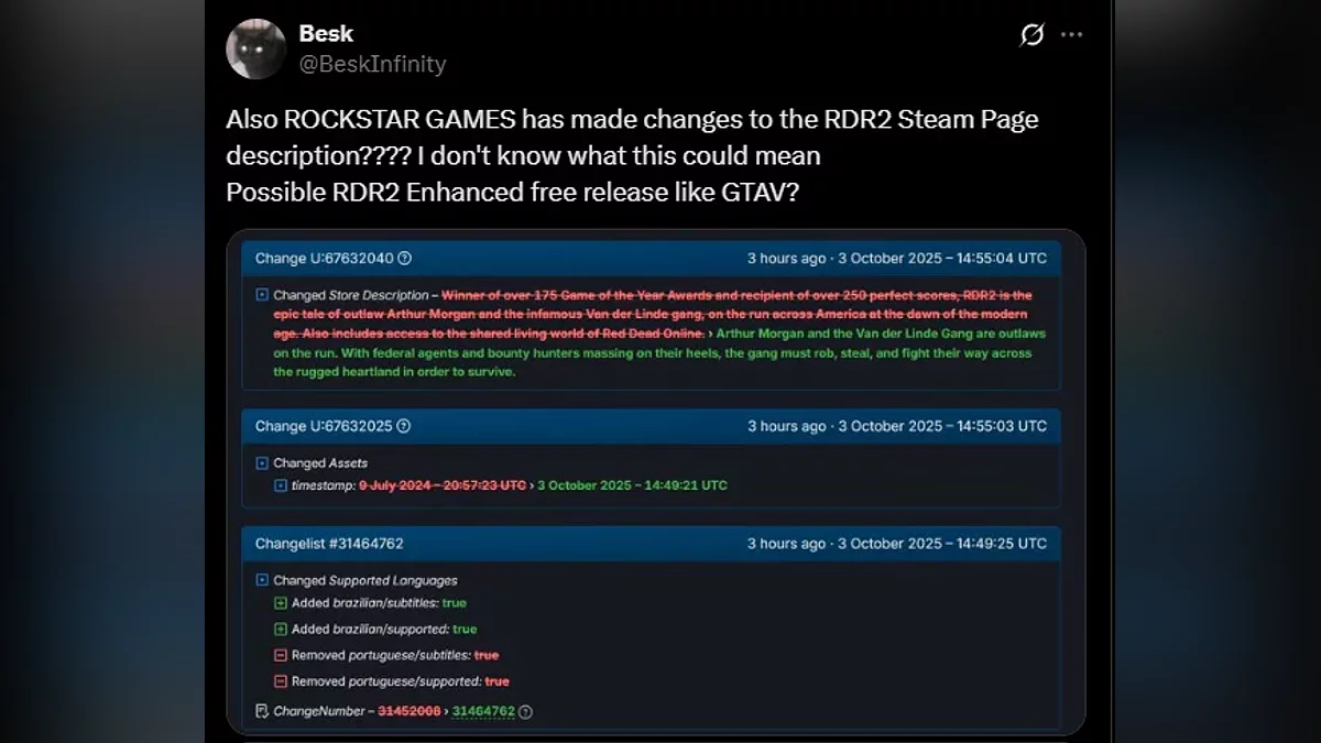 Изменения заметили через базу данных Steam DB. Из описания игры удалили упоминание Red Dead Online, убрали португальские и добавили бразильские субтитры, а также изменили один из ассетов. Если это не рядовое обновление страницы, то Rockstar Games вполне может готовиться к релизу RDR 2 Enhanced. Это улучшенная версия игры для современных систем, которая, если верить слухам, будет доступна уже в этом году на PC, PS5, Xbox Series X/S и Nintendo Switch 2.