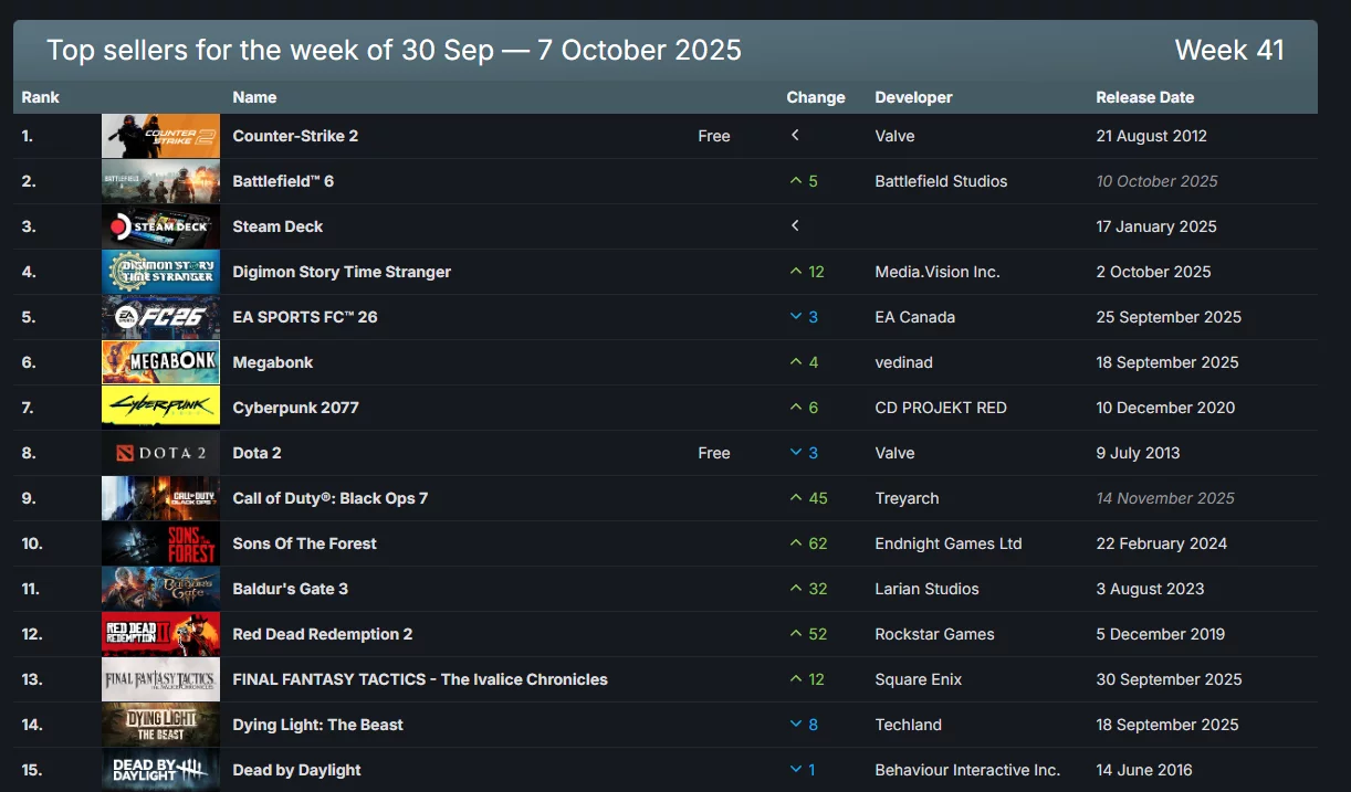 До выхода Battlefield 6 остаются считанные дни, но шутер уже оказался в числе самых популярных игр недели в Steam. Проект от EA занял первое место среди платных продуктов и второе — в общем чарте, уступив только Counter-Strike 2.