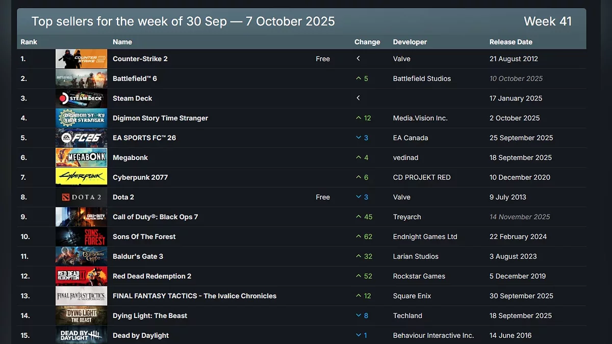 Осенняя распродажа помогла вернуться в десятку старым хитам вроде Baldur's Gate 3, Red Dead Redemption 2 и Cyberpunk 2077, а несколько новинок отметились рекордным онлайном — Megabonk собрала более 117 тысяч игроков, а Digimon Story Time Stranger — 84 тысячи.