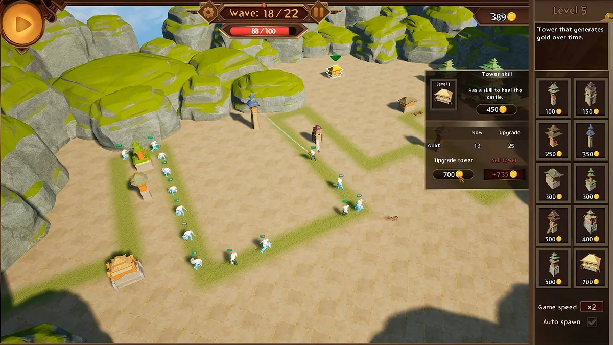 Игрок сталкивается с разнообразными монстрами с разными характеристиками и особенностями, получает золото за их уничтожение для строительства и улучшения башен, а также сражается с более сильными боссами на каждой десятой и пятой волне. Оптимальное расположение башен и использование их навыков в сочетании с разнообразием типов является ключом к успешной защите замка, а полное прохождение уровня без пропущенных монстров открывает специальные уровни с уникальными механиками. Раньше проект стоил 200 руб.
