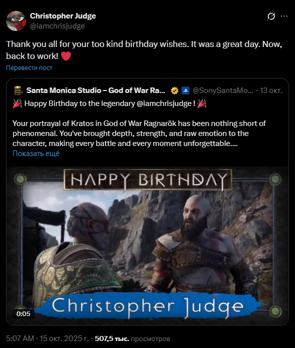 На днях студия Santa Monica отпраздновала 61-летие исполнителя роли Бога войны, разместив поздравительный пост в честь актёра. Ответ не заставил себя долго ждать — Джадж репостнул запись к себе и опубликовал благодарность команде: «Спасибо всем за ваши тёплые поздравления с днём рождения. День был чудесным. А теперь за работу!»