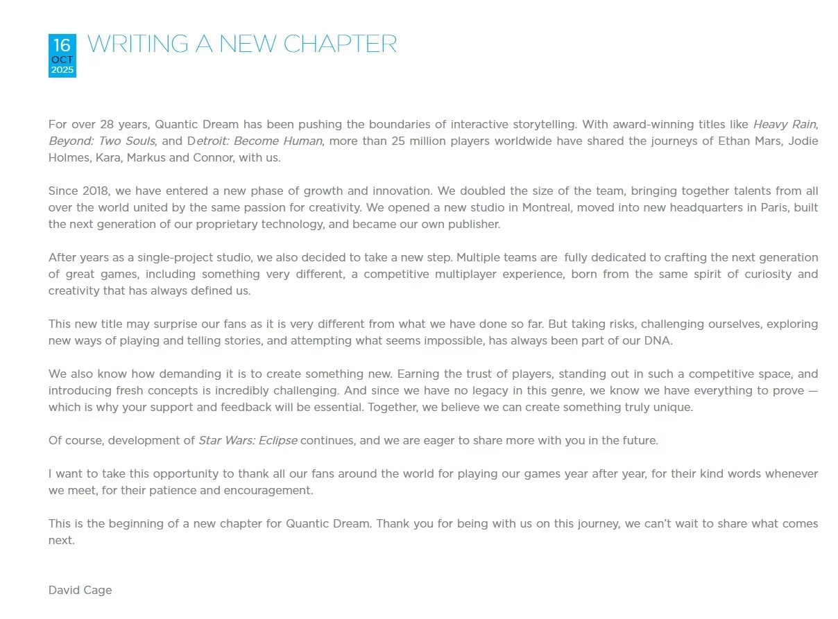 Студия Quantic Dream, известная по Heavy Rain, Beyond: Two Souls и Detroit: Become Human, объявила о начале нового этапа в своей истории. В официальном обращении основатель студии Дэвид Кейдж (David Cage) рассказал о планах компании и подтвердил, что команда работает над новым, неожиданным для фанатов проектом.