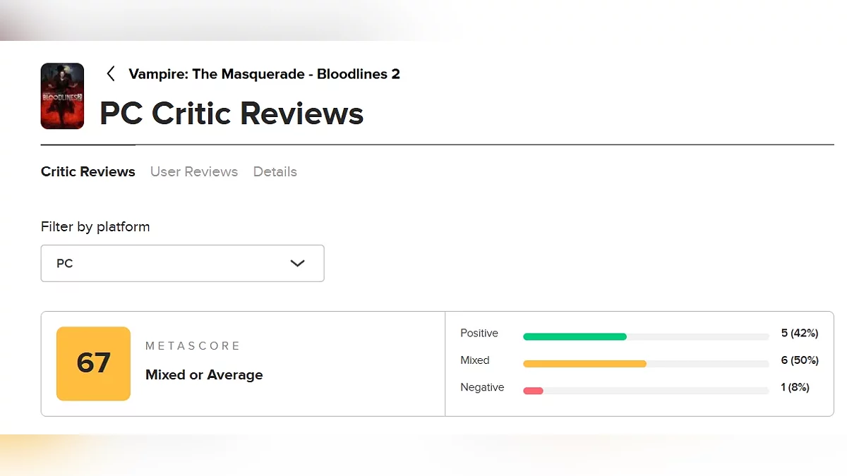 В сети начали появляться первые оценки ролевого экшена Vampire: The Masquerade — Bloodlines 2. На момент написания рейтинг на Metacritic составляет 67 баллов, но он может измениться, когда появится больше рецензий.