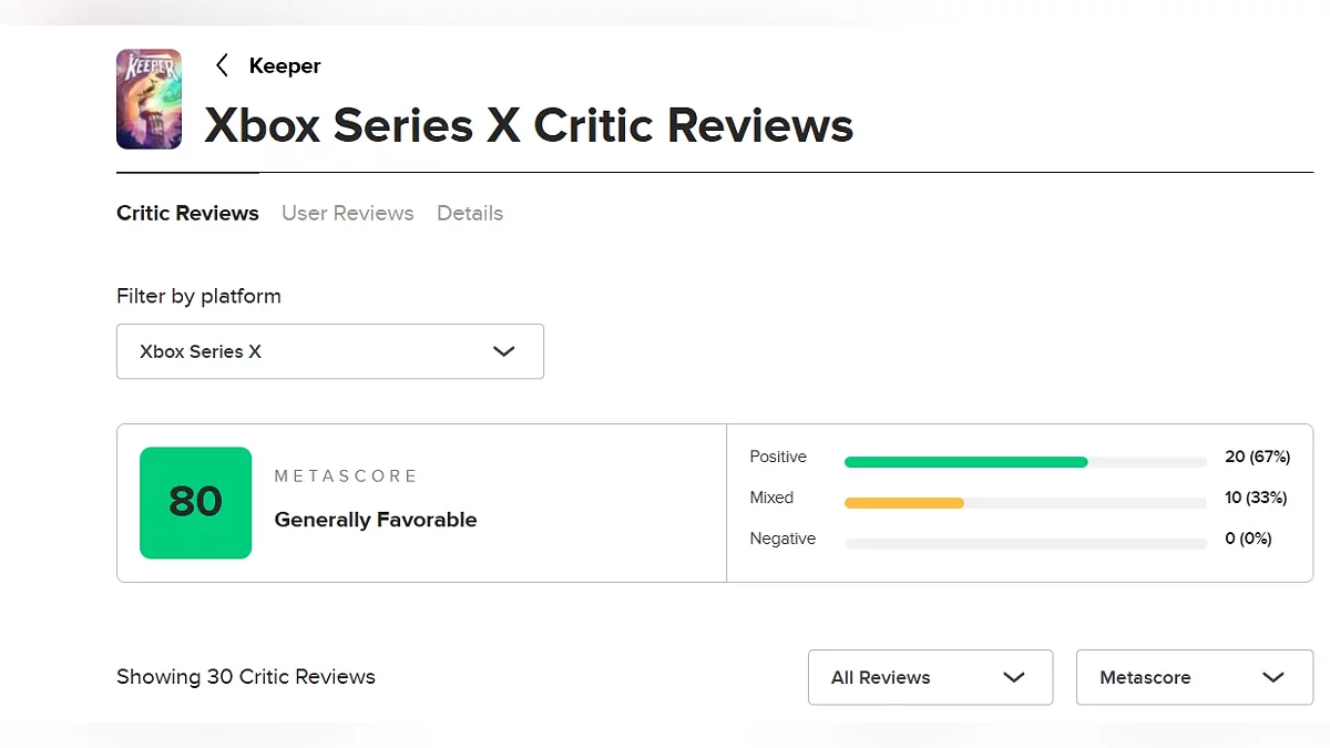 Keeper вряд ли станет следующим массовым хитом Xbox, но это великолепное достижение в области художественного оформления, игрового дизайна и немого повествования. Keeper — результат того, что страстной и крайне креативной команде дали время и ресурсы, необходимые для создания их шедевра, и в неё лучше играть, имея как можно меньше предварительных знаний.