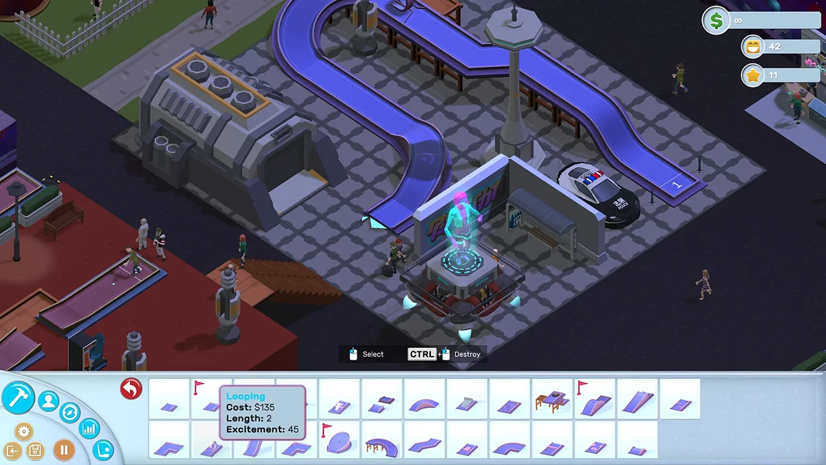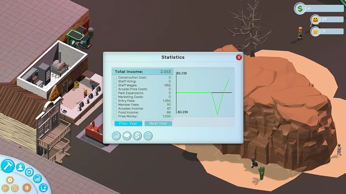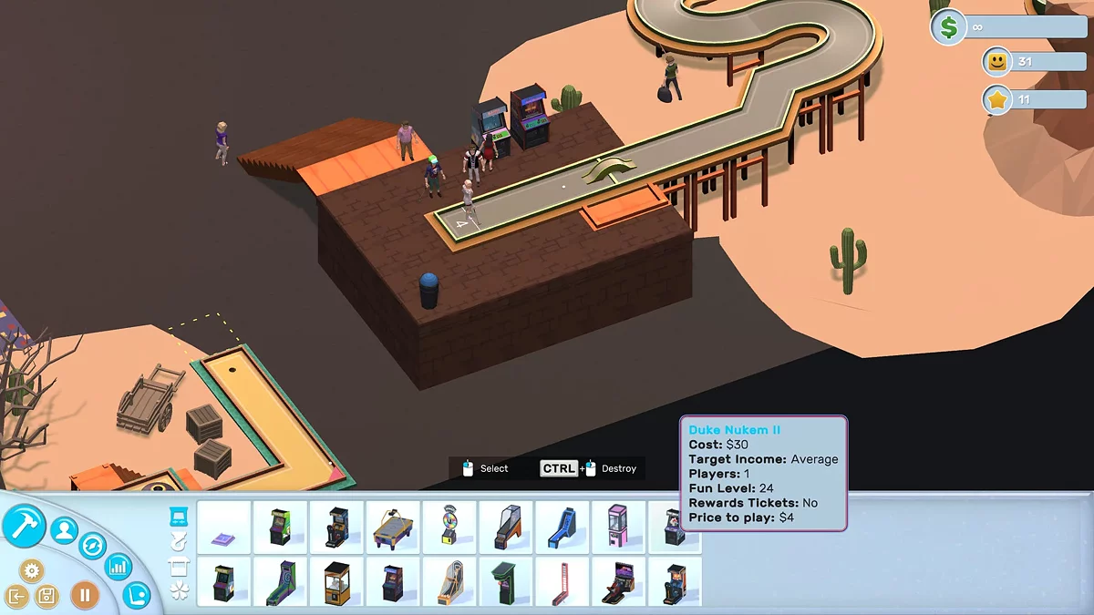 Игра сочетает изометрическую ретро-графику и вид от первого лица, предлагает более 70 предметов для кастомизации, гибкое размещение объектов, систему турниров и управление всеми аспектами бизнеса — от аркадных призов до меню фуд-корта. Раньше проект стоил 200 руб.