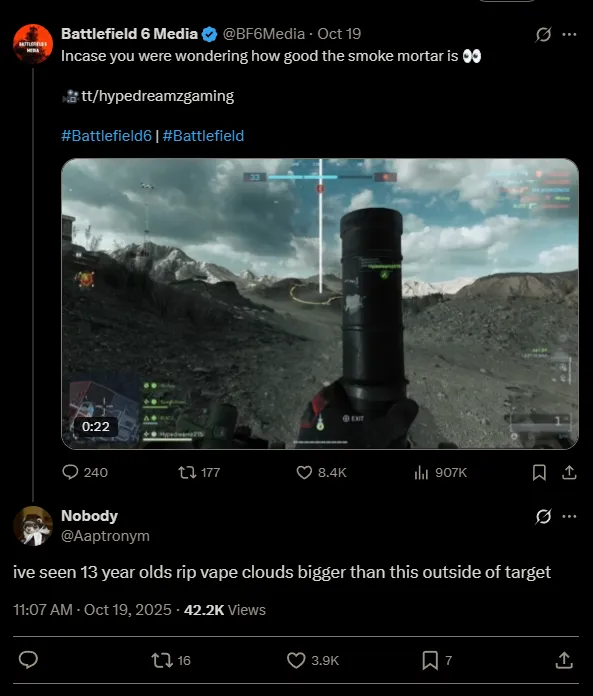 «Дым для муравьёв»: игроки Battlefield 6 высмеяли бесполезный дымовой миномёт