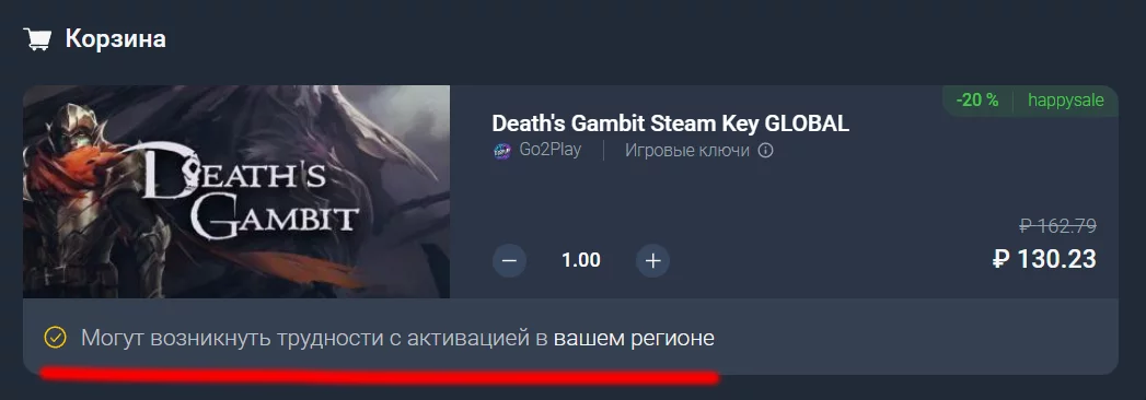 В связи с санкциями многие издатели удалили свои игры из российского Steam. В таком случае с активацией ключа в этом регионе могут возникнуть проблемы. Соответствующая надпись будет в описании товара: