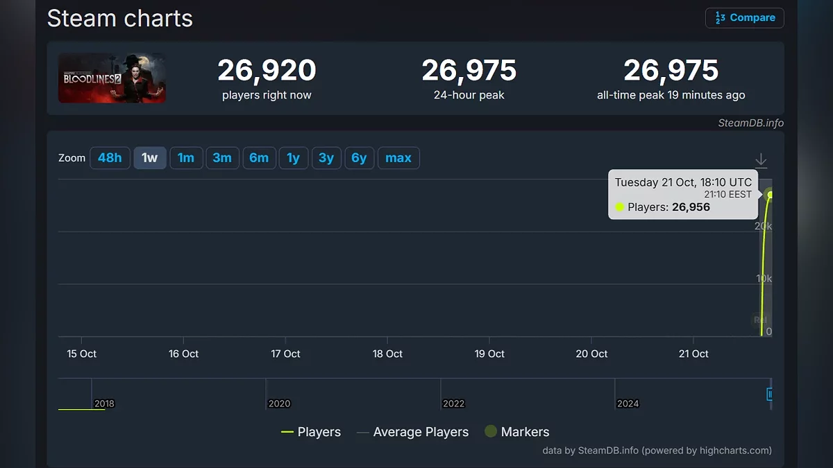 Что касается пикового онлайна, на момент написания новости в игре было зафиксировано почти 27 тыс игроков.