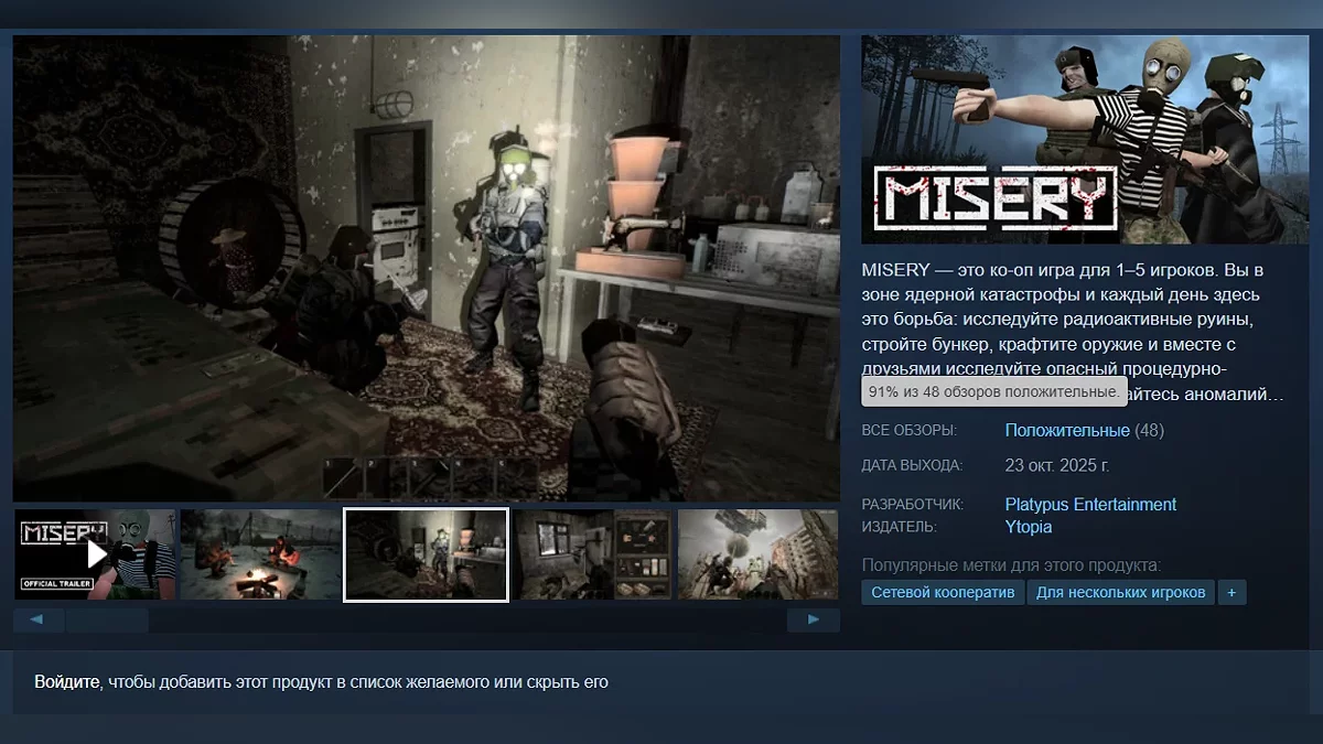 MISERY описывается как экшен с элементами выживания и упрощенного рогалика с кооперативом (до 5 игроков), который подойдет любителям атмосферных игр вроде Lethal Company и S.T.A.L.K.E.R..