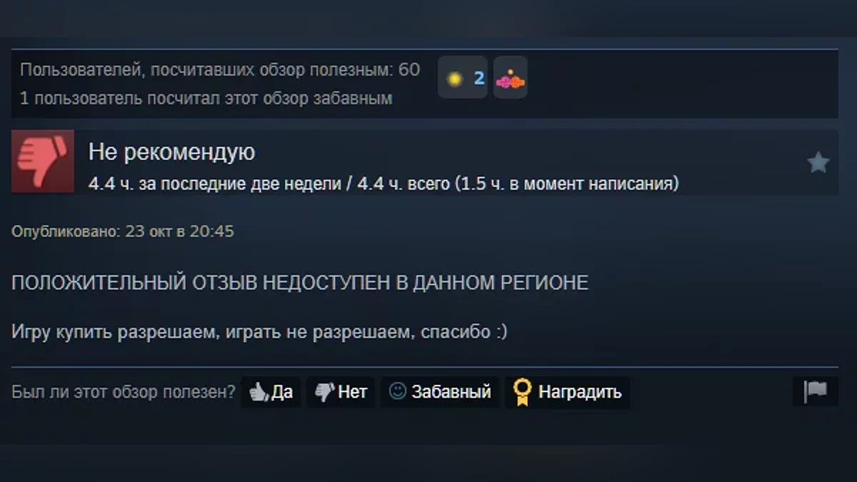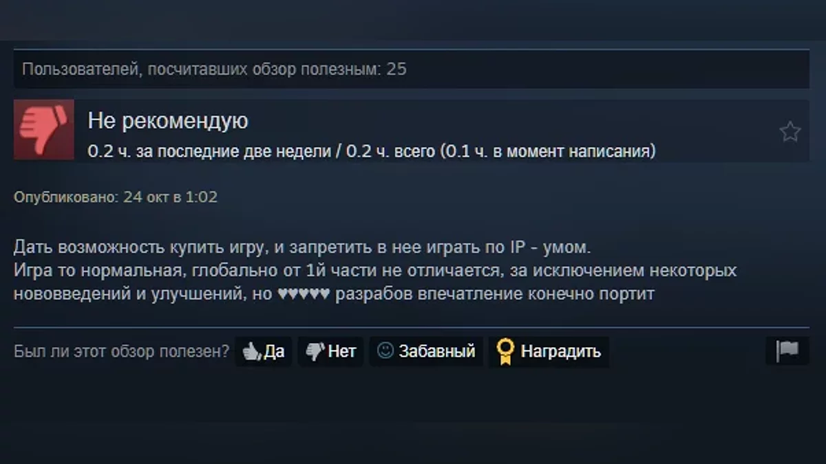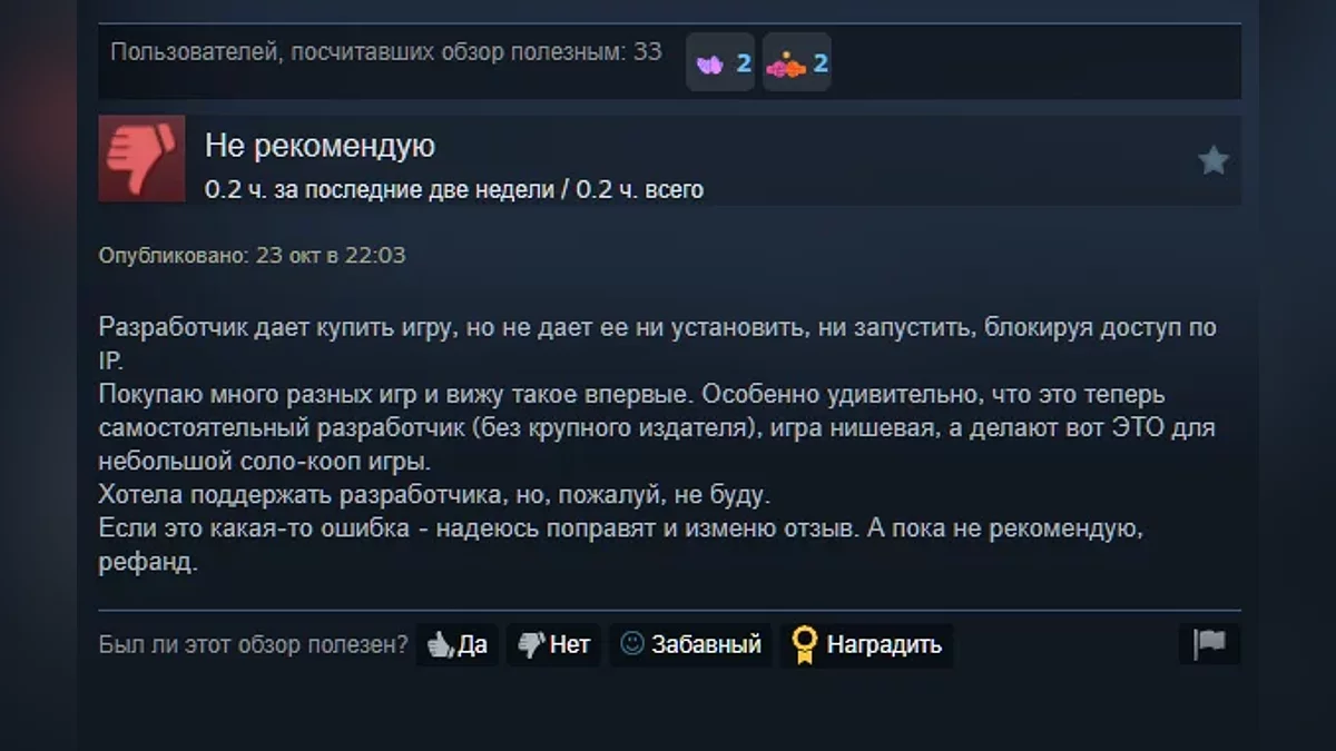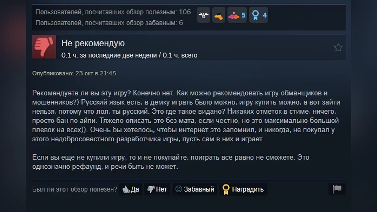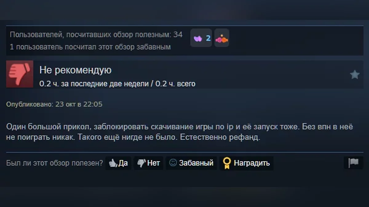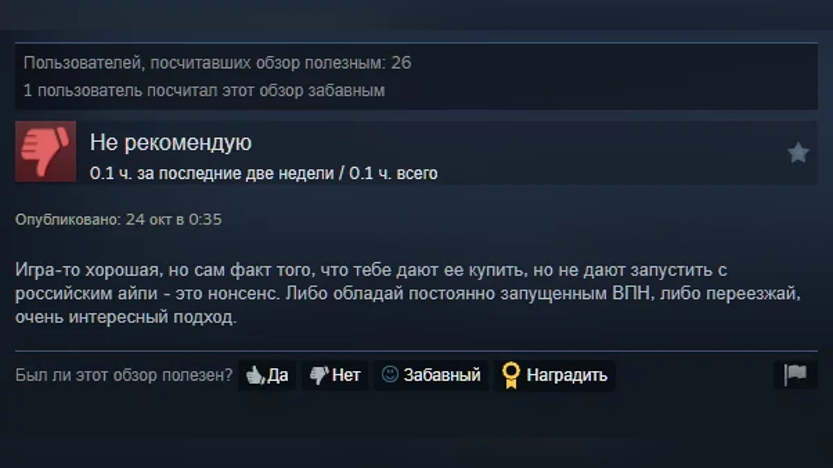 Стоит заметить, что множество русскоязычных геймеров поставили новинке отрицательный отзыв. Судя по комментариям, разработчики ограничивают доступ устройствам с российскими IP-адресами, даже если игра куплена в другом регионе. Некоторые пользователи написали, что игра также не работает в Казахстане, хотя доступна для покупки за 6400 тенге (970 рублей).