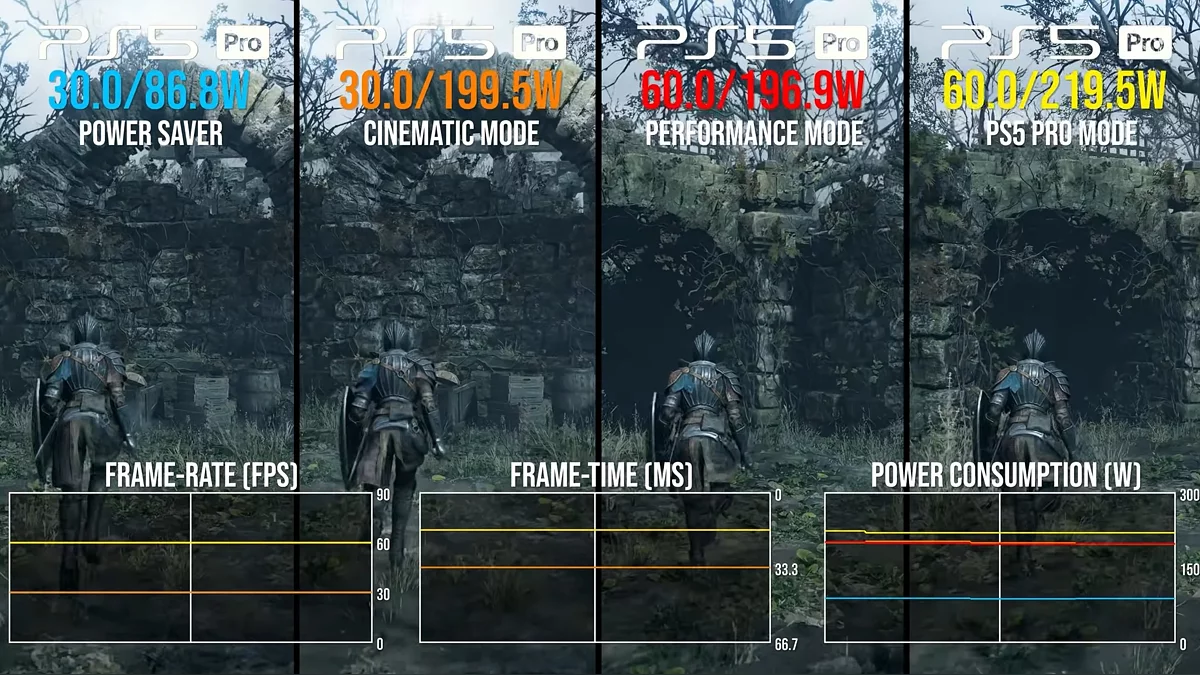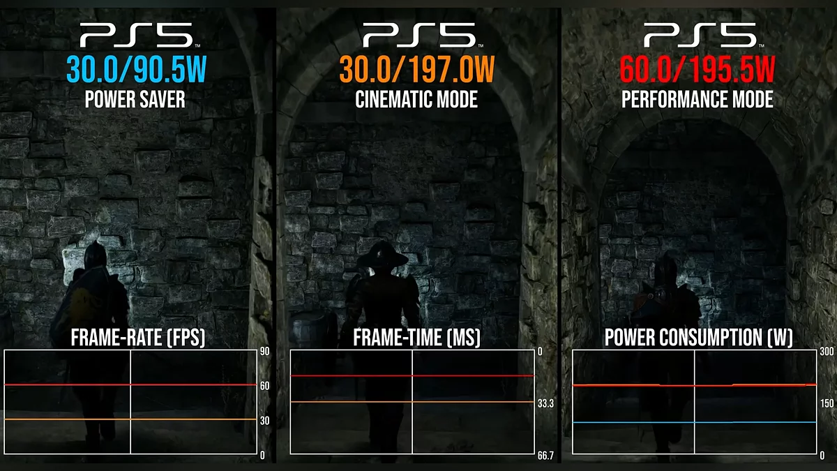 Первой протестированной игрой стала Demon's Souls — в «энергосберегающем» режиме она просто теряет половину кадров: 30 FPS вместо 60, но разрешение остаётся 1440p. Зато энергопотребление снижается с 200 до 90 Вт.