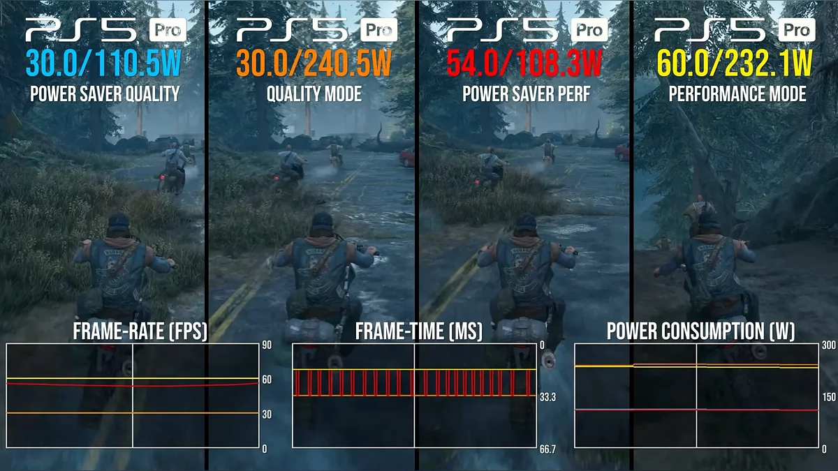 У Days Gone добавили сразу два режима: на 60 и 30 FPS. Диапазон масштабирования разрешения сократили, и теперь в пиковых сценах FPS падает до 45, а в среднем держится около 50. При этом потребление энергии падает с 240 до 110 Вт.
