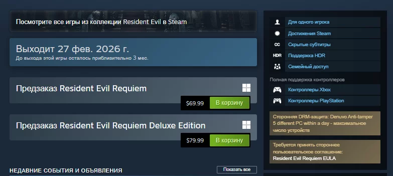 Ожидаемо: Capcom указала наличие системы защиты Denuvo на обновлённой странице Resident Evil Requiem в Steam. Несмотря на удаление программы из других игр, компания активно оберегает свежие релизы.