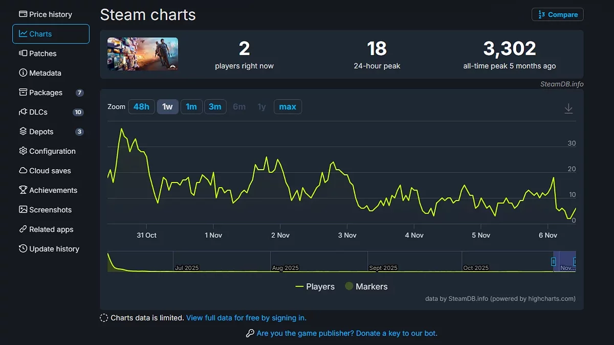 Согласно данным Steam DB, пиковый онлайн за всё время составил лишь 3302 игрока, а сейчас проект едва держится выше отметки в десять человек. И это при том, что релиз состоялся всего несколько месяцев назад — 10 июня.